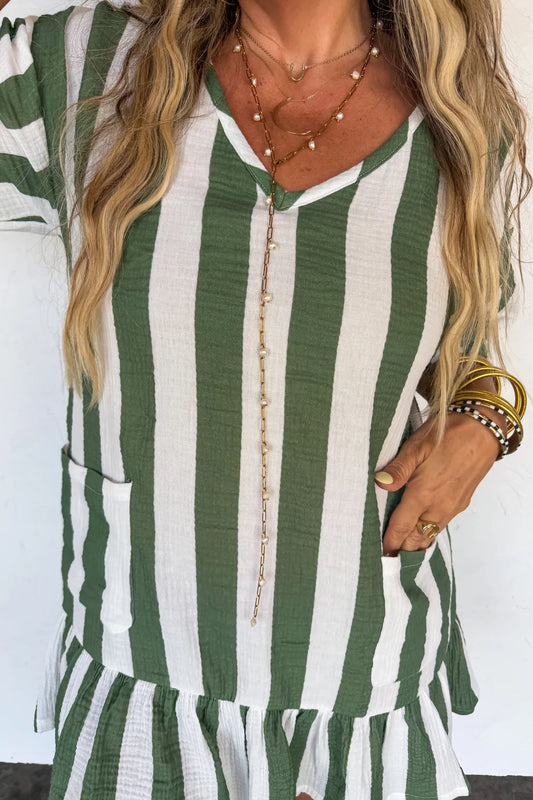 Green and White Striped V-Neck
