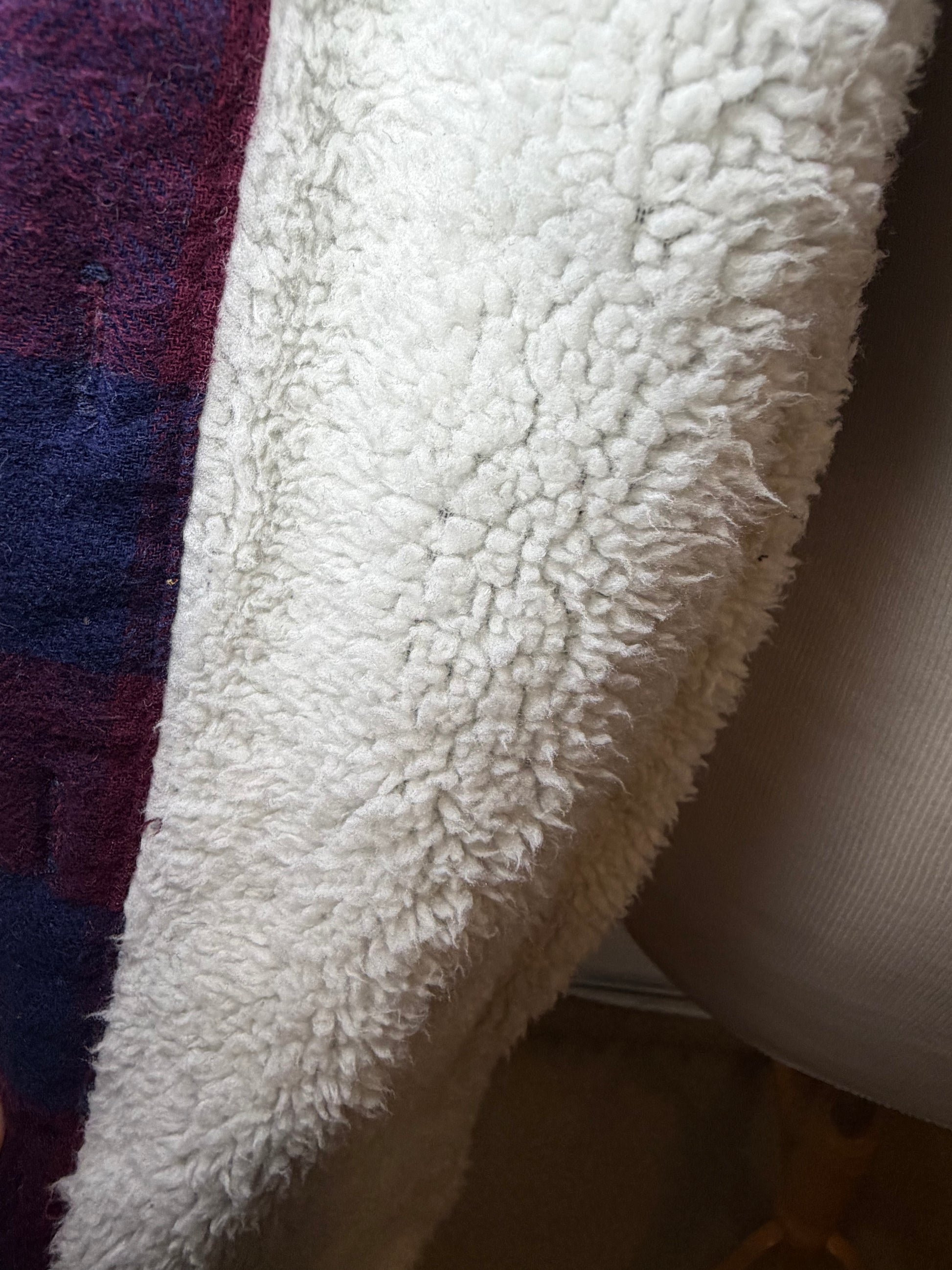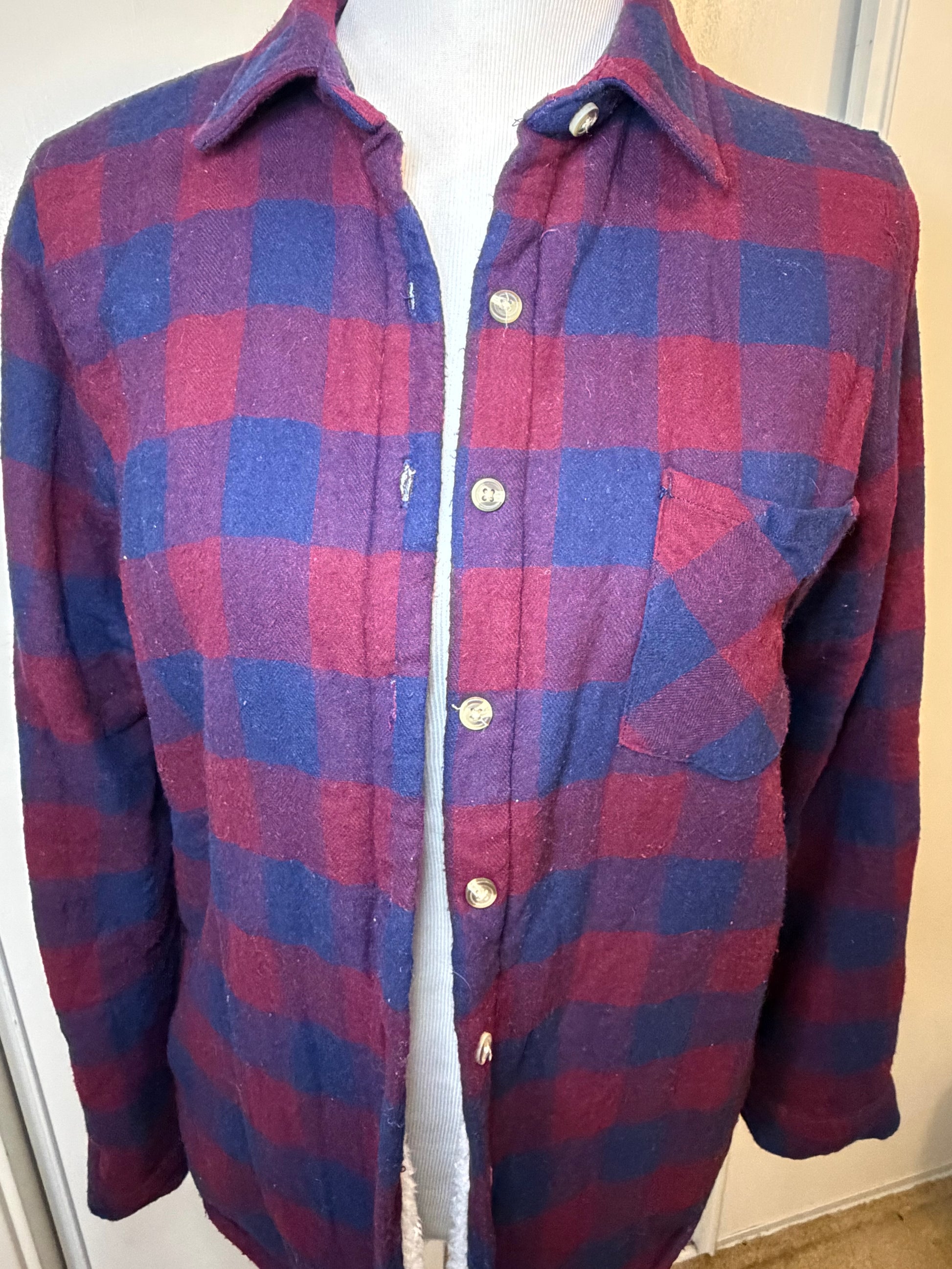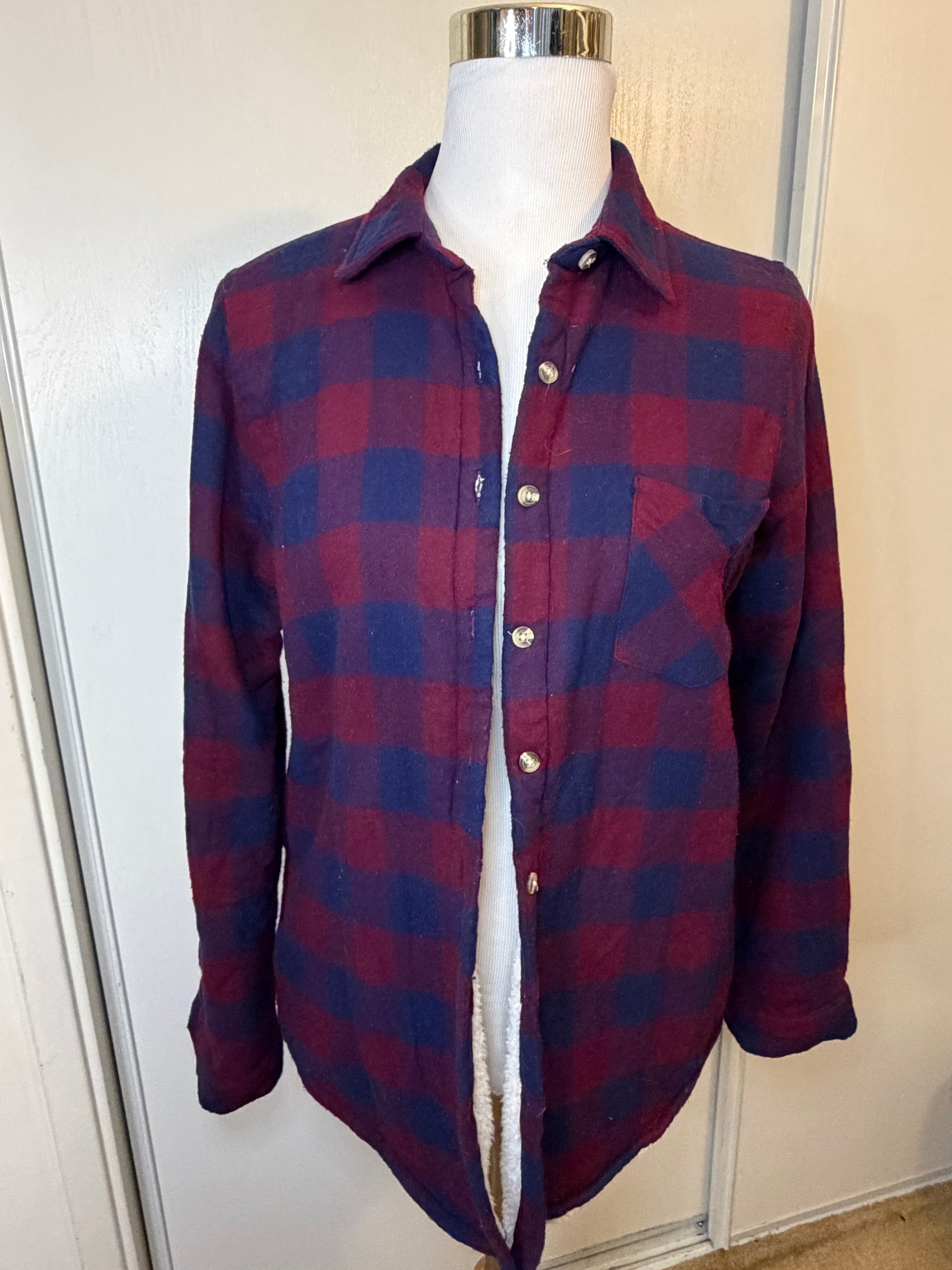 Previously worn burgundy and navy plaid button down shacket with lining
