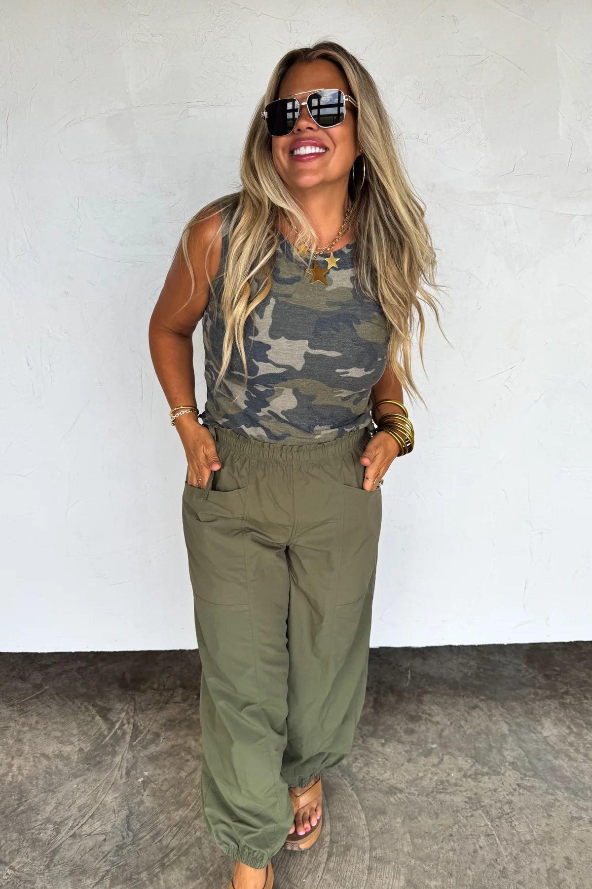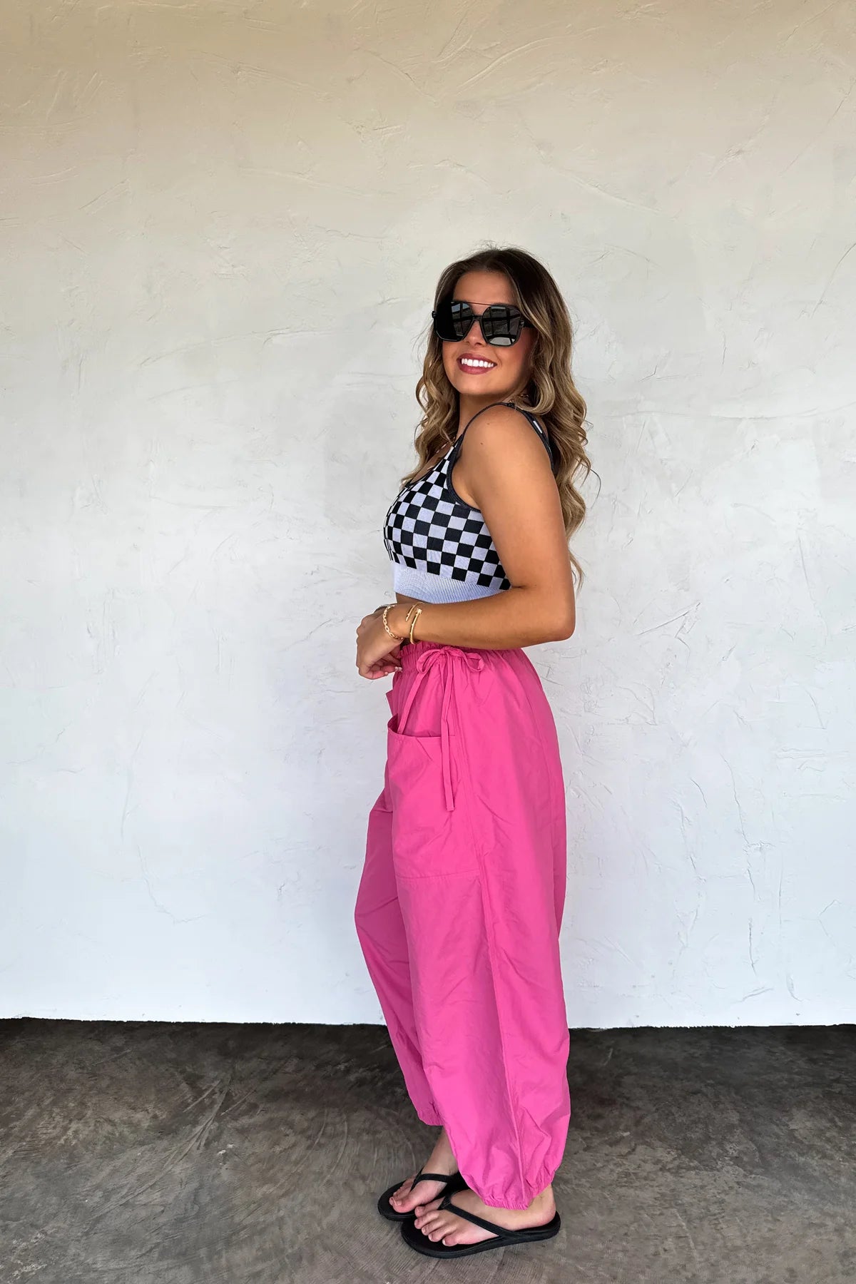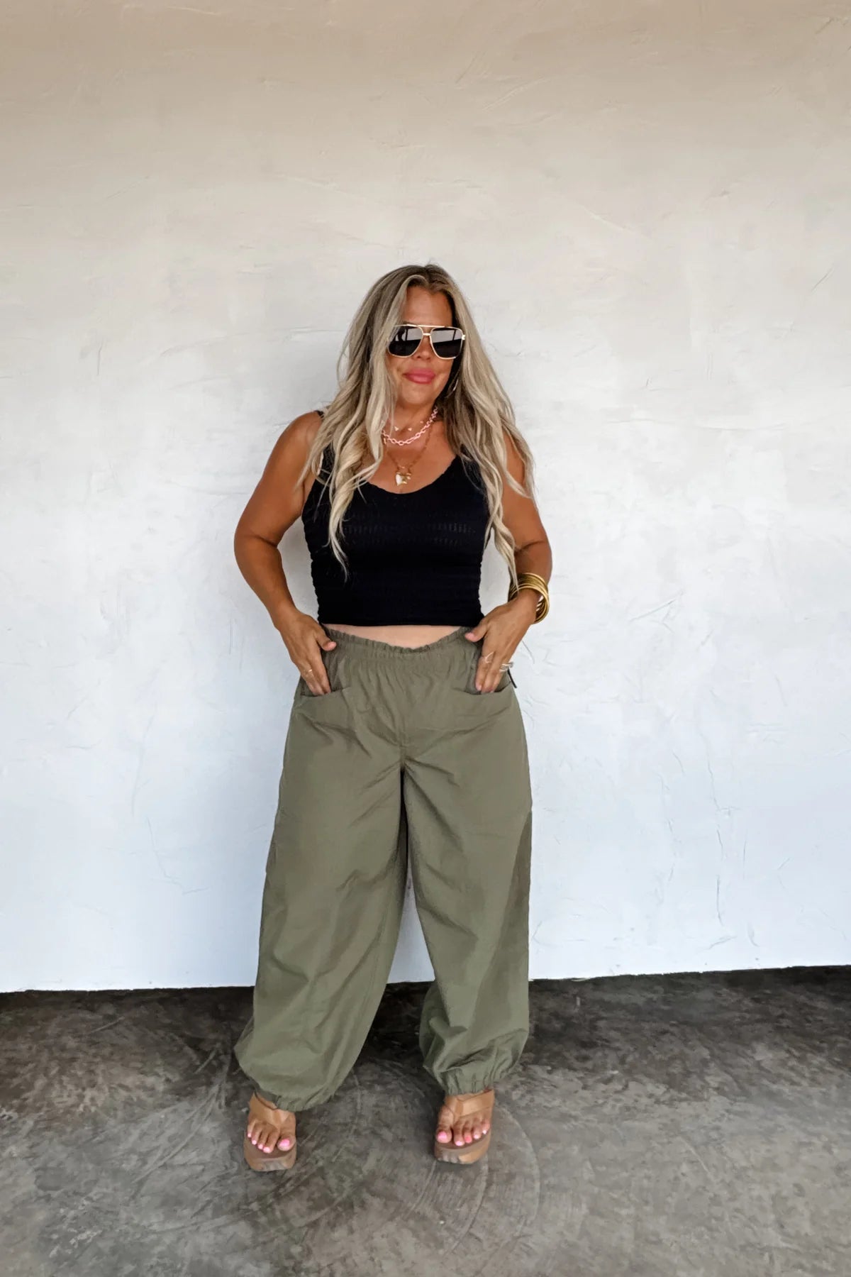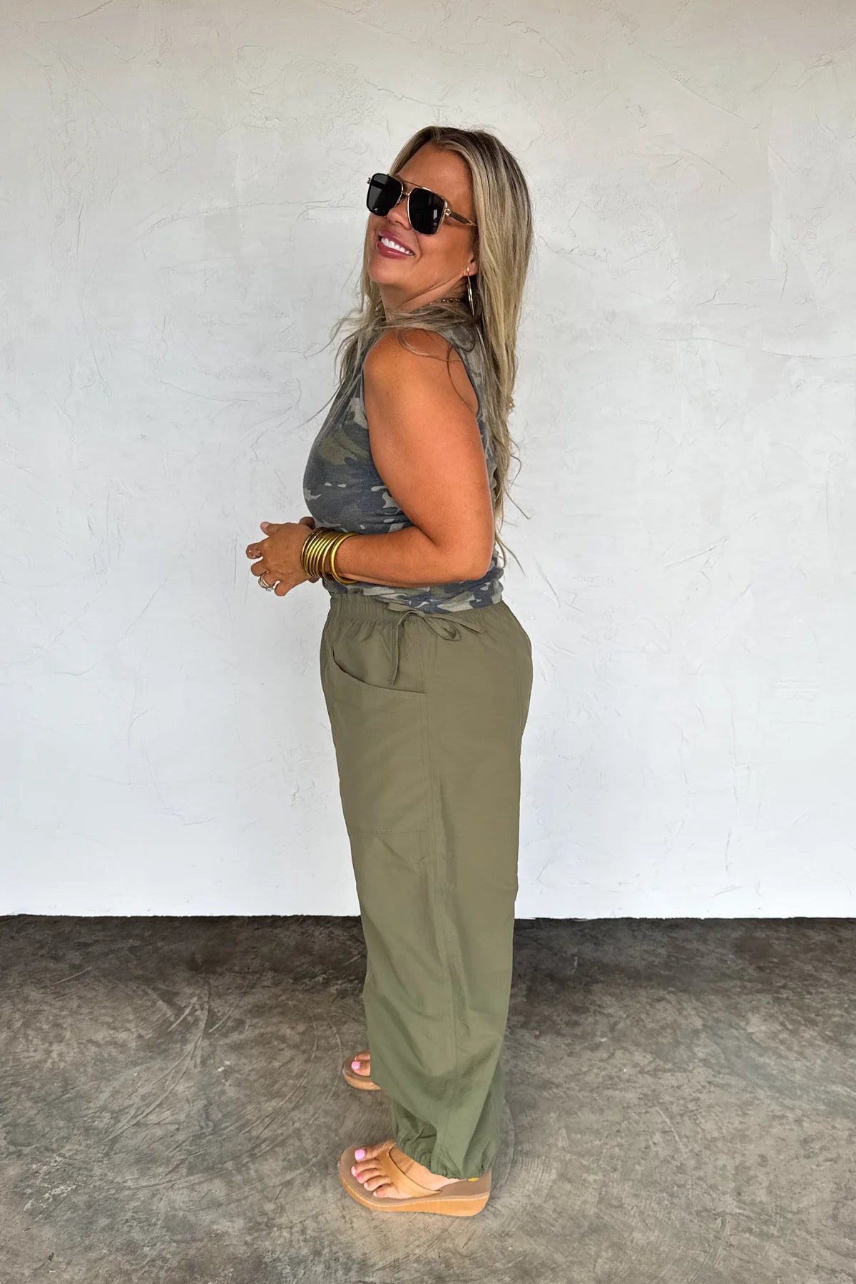The perfect in style, pull on and go pant! This windbreaker style pant is designed with an elastic waistband, adjustable side ties, roomy pockets, and a loose elastic ankle