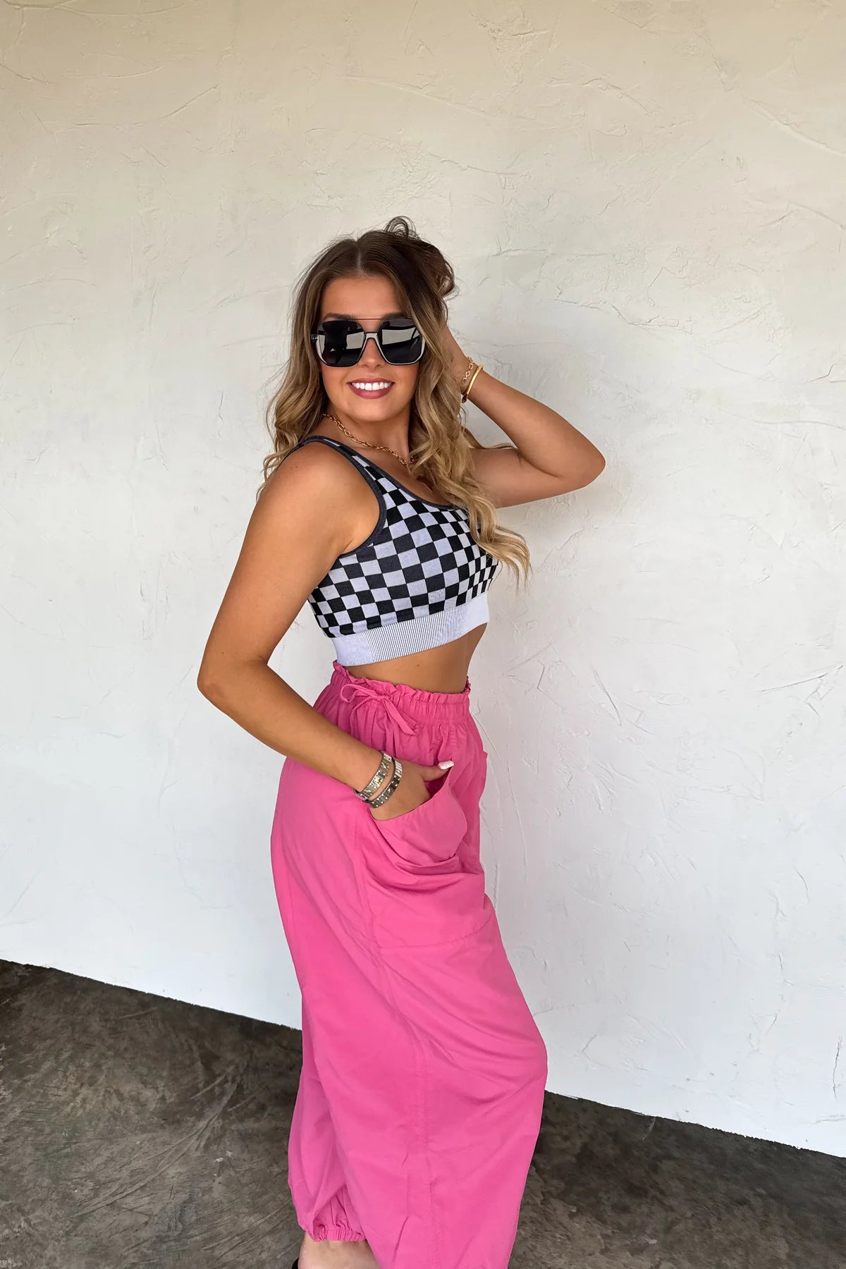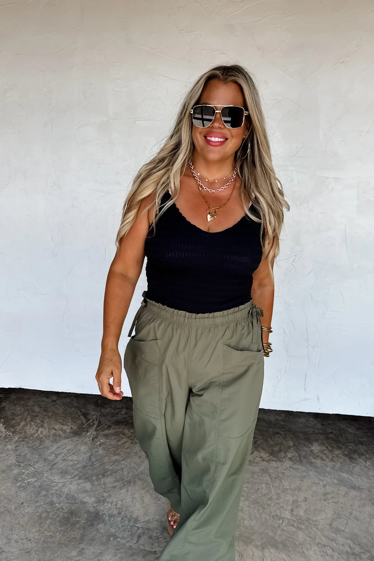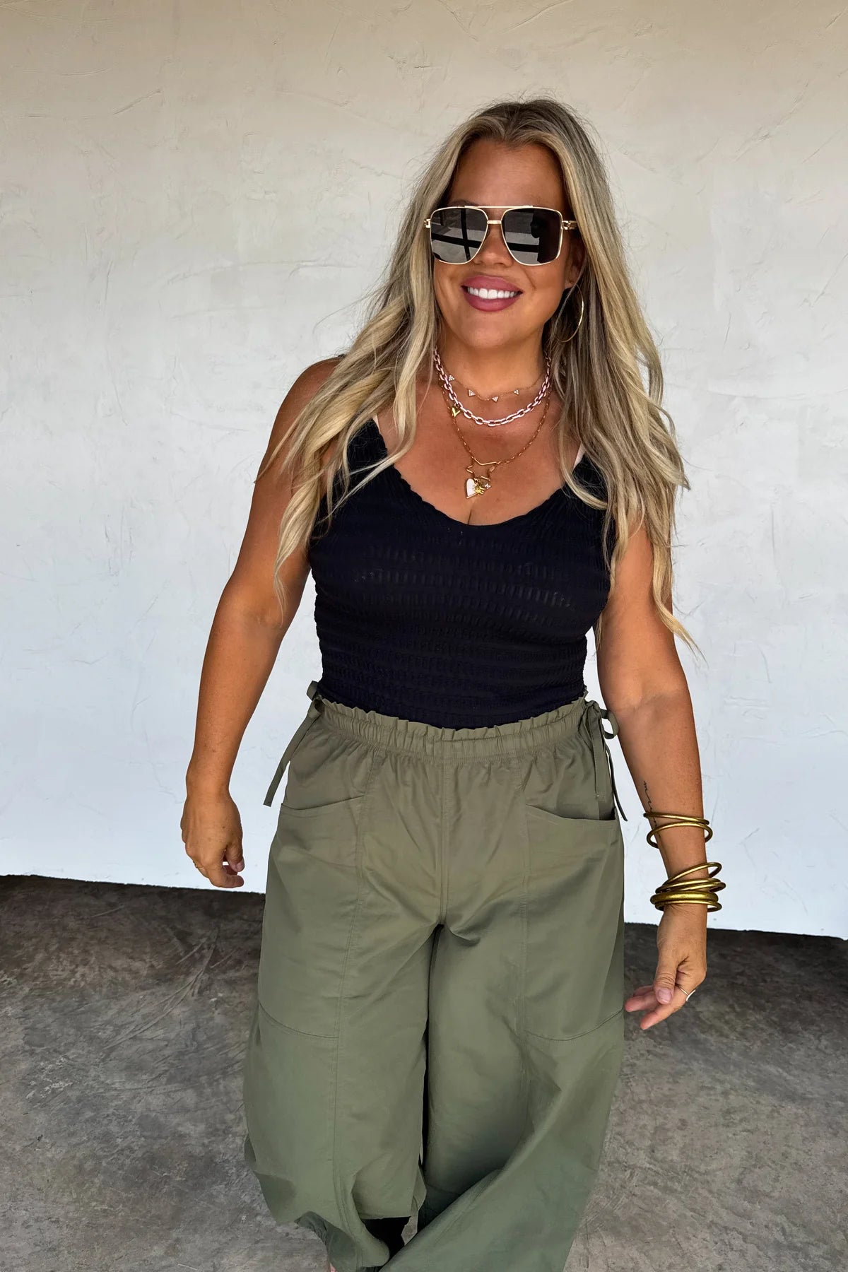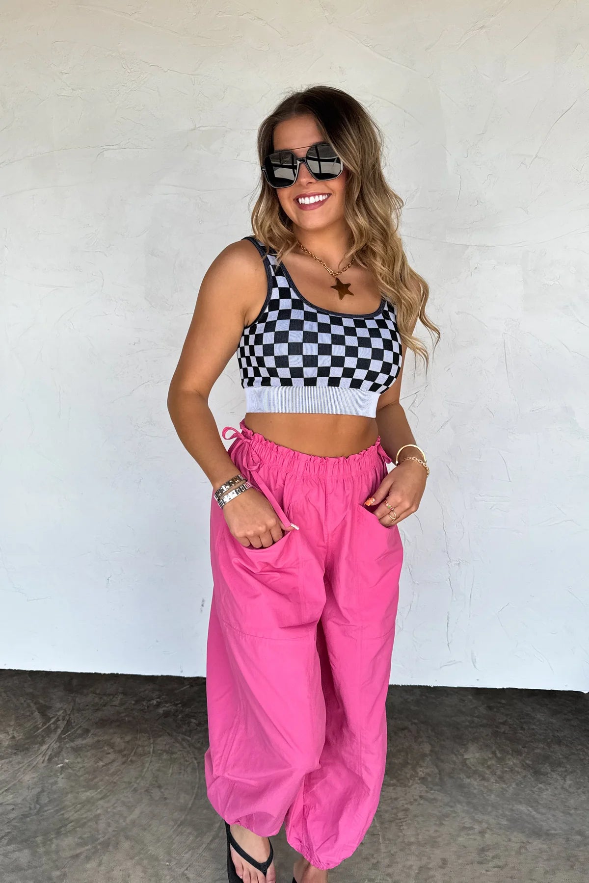 The perfect in style, pull on and go pant! This windbreaker style pant is designed with an elastic waistband, adjustable side ties, roomy pockets, and a loose elastic ankle