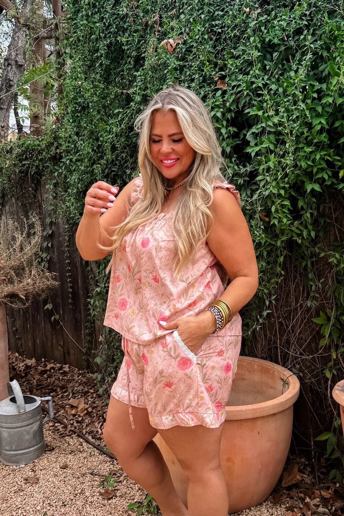 A lightweight tank and short set featuring a soft floral print and an easy, relaxed fit. Tank features an elastic bust with ruffle shoulder straps. Shorts have the cutest eyelet lace trim on the pockets with an elastic drawstring waistline. Designed for all-day comfort with a breezy feel—perfect for lounging, casual days, or warm-weather wear.