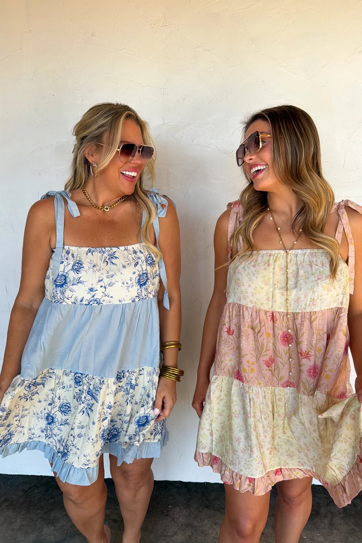 Features a soft tiered silhouette with contrast floral panels that create a feminine, romantic look. Designed with adjustable shoulder tie straps for a customizable fit, along with elastic across the neckline and bust for added stretch, comfort, and flexibility in sizing. The lightweight woven fabric offers a breathable feel while the flowy skirt provides movement and ease throughout the day.
