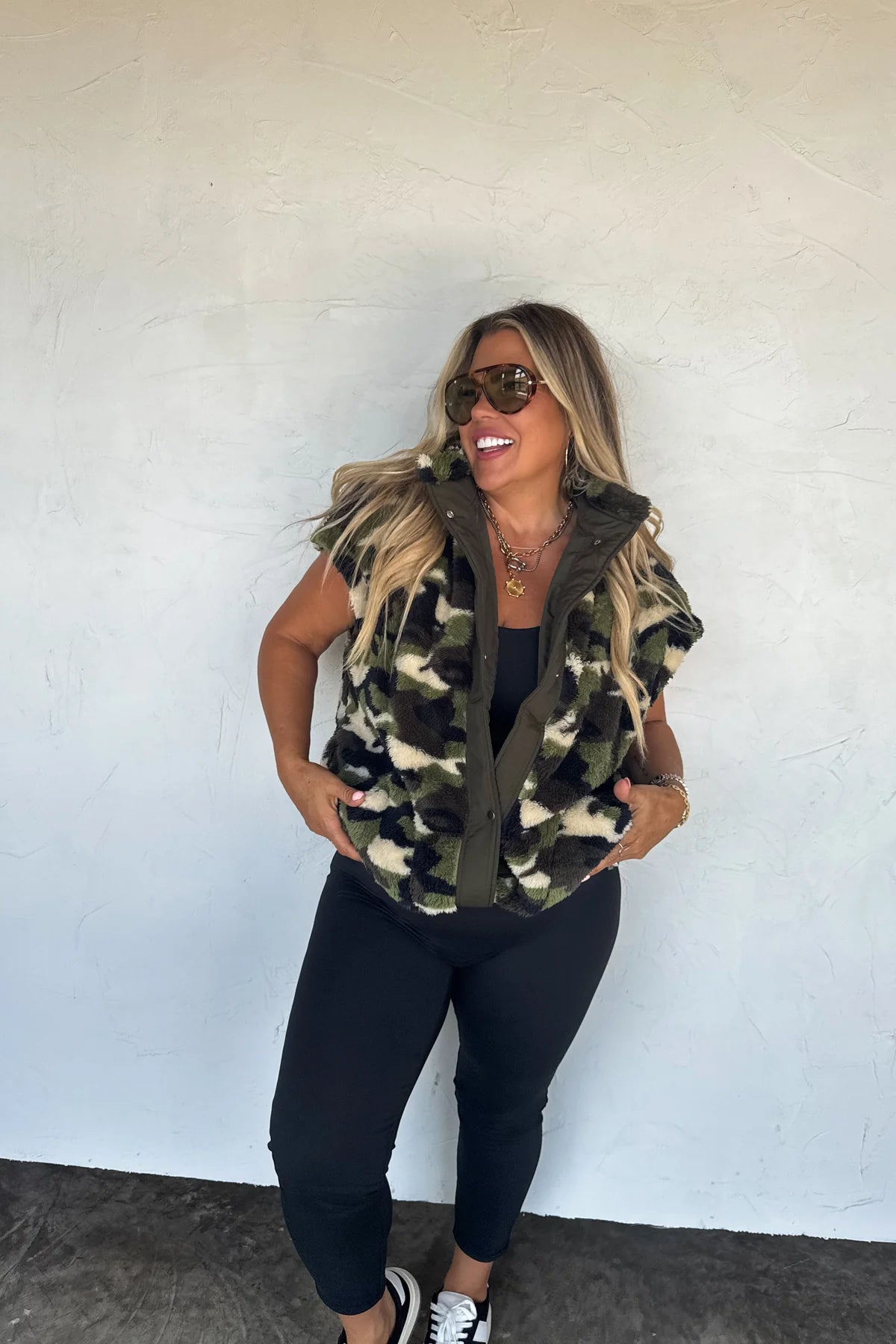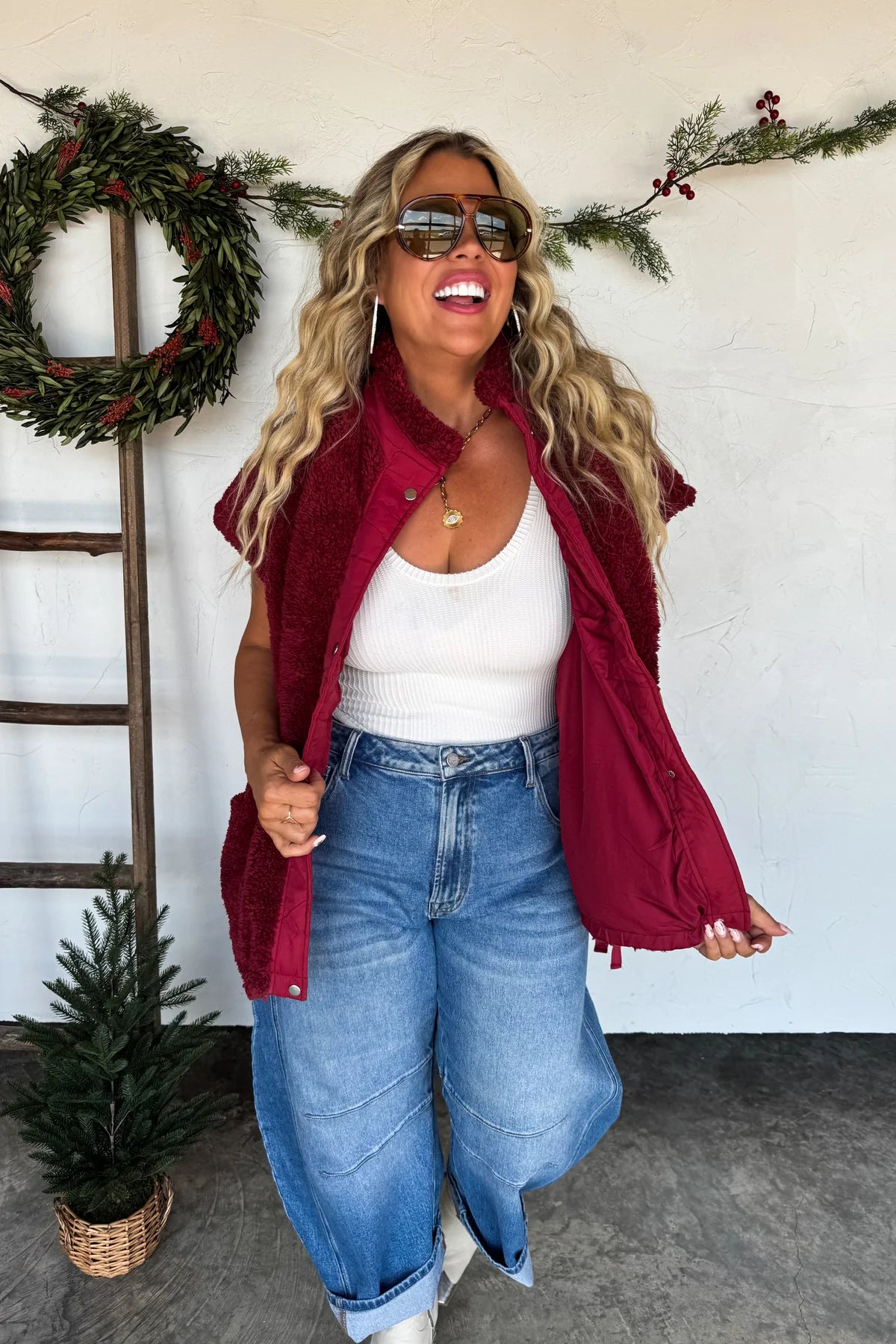 These stylish vests feature bold colors and prints in soft, plush faux fur sherpa, giving it a cozy and luxurious look. It has a high collar and longer cap sleeve design with snap button closures down the front. Also features side pockets and side tie strings for cinching or wearing shorter if preferred. Perfect for layering, it adds a fun, fashionable edge to any outfit.