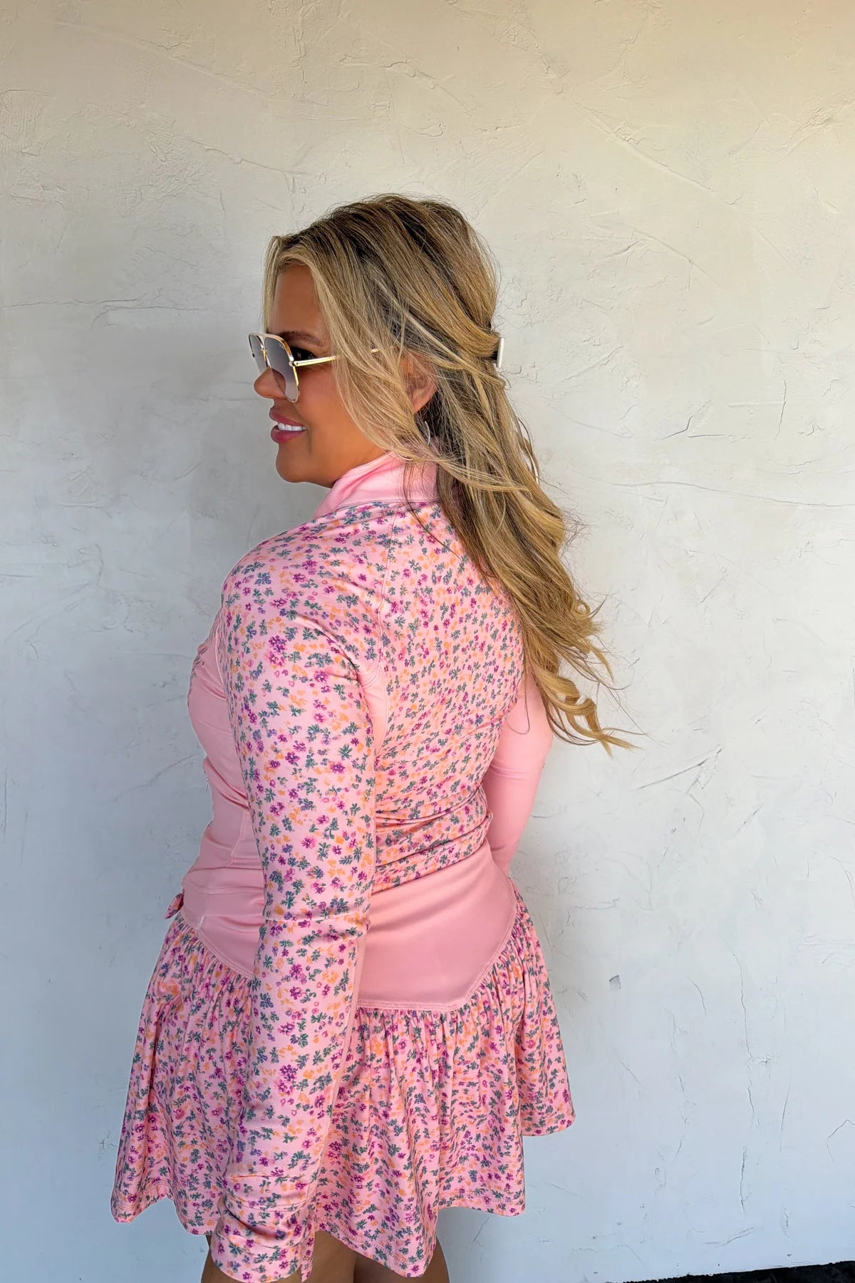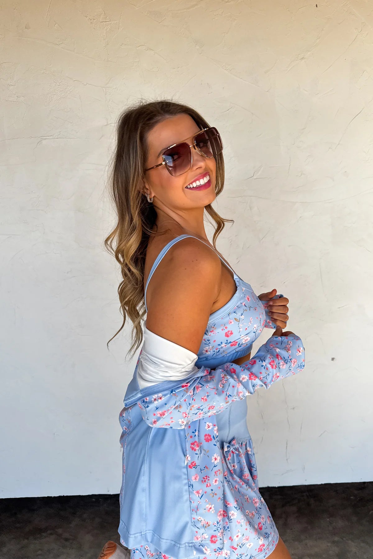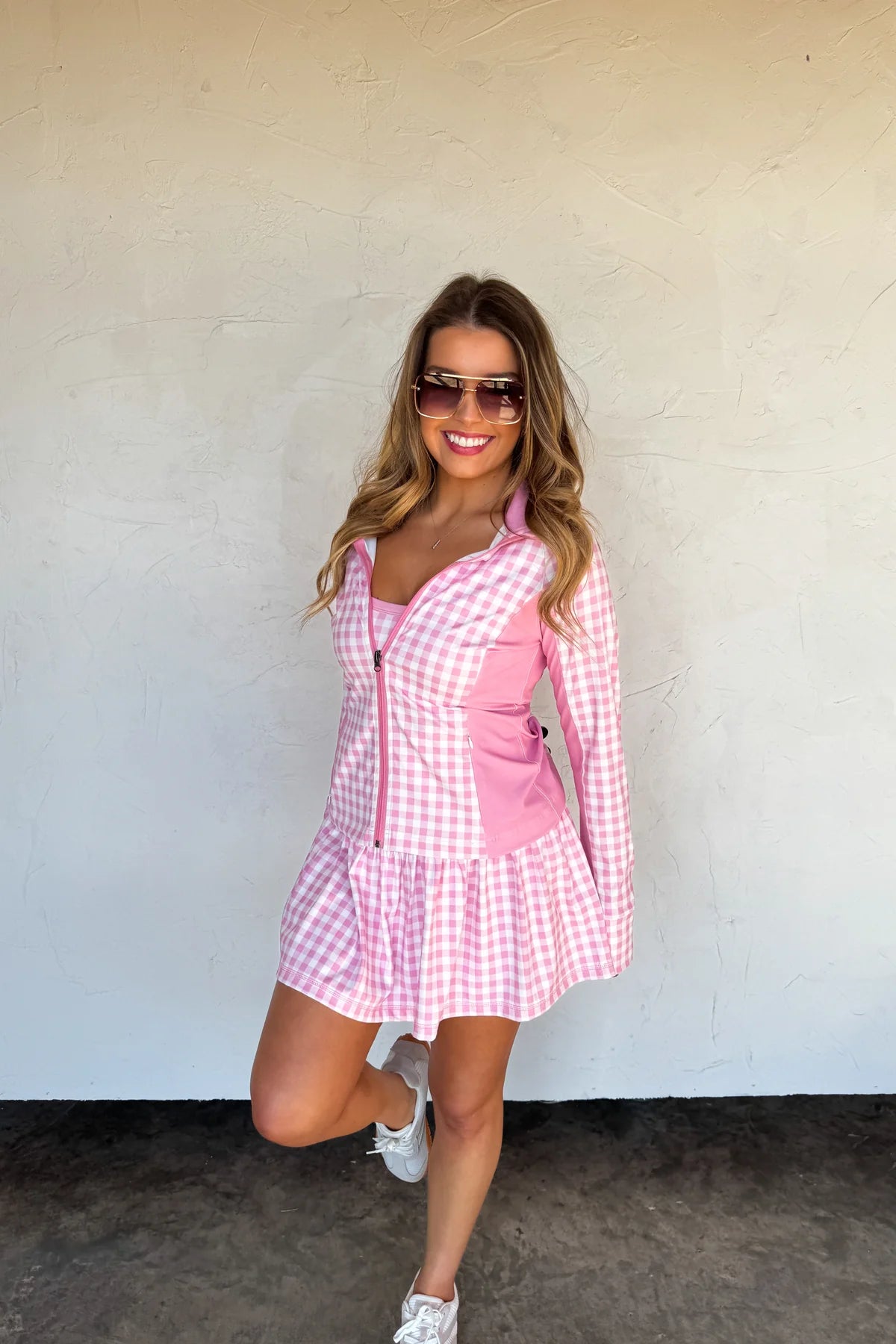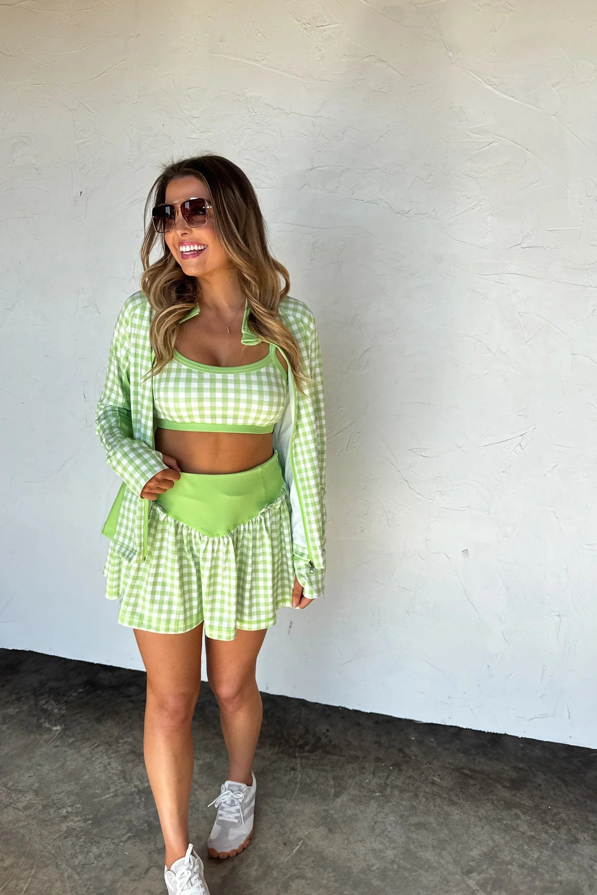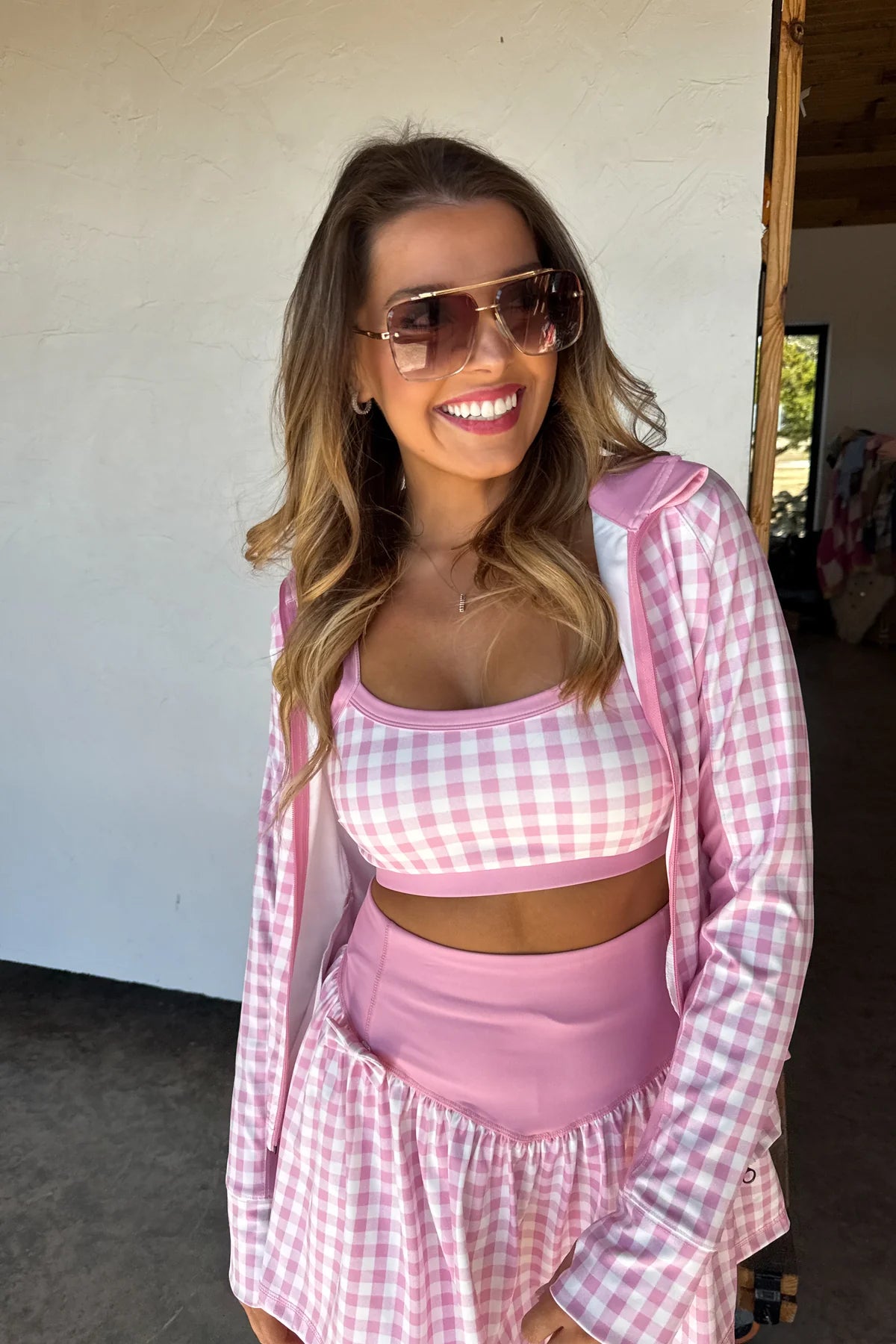 Introducing the OUT THE DOOR ZIP UP JACKET — a versatile and coordinating layering piece that matches our other "Everyday Motion" pieces. Features a charming floral and gingham pattern that effortlessly blends feminine style with casual comfort. The full front zip closure allows for easy on-and-off wear, while dual side zip pockets provide secure storage for your essentials. Features thumbhole cuffs.