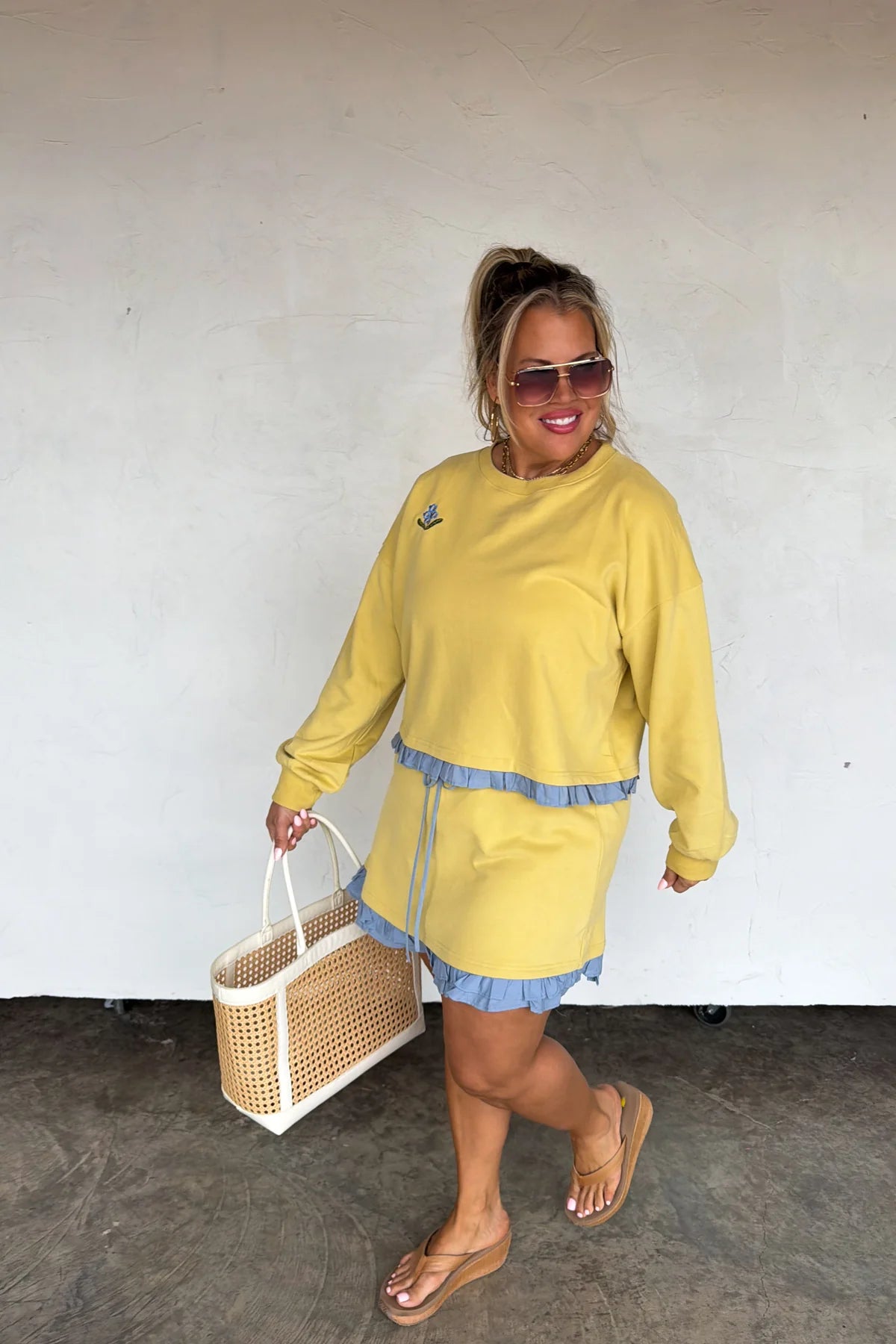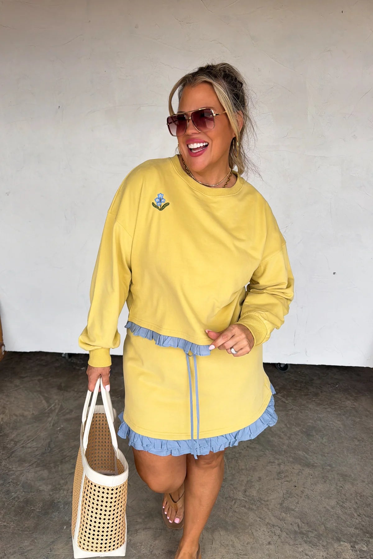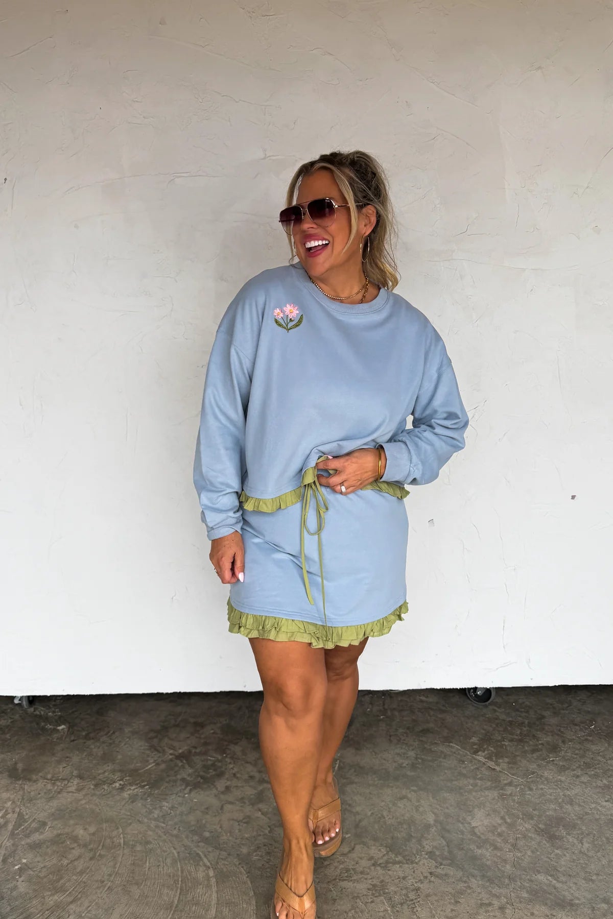 Stay comfy and cute in this ruffle trim short set! This playful two-piece includes a relaxed-fit sweatshirt and matching shorts with contrast ruffle detailing for a fun, feminine touch. Top has embroidered flower detail. Made from soft washed terry cotton fabric giving it a vintage wash look. Perfect for lounging, travel days, or casual outings.
